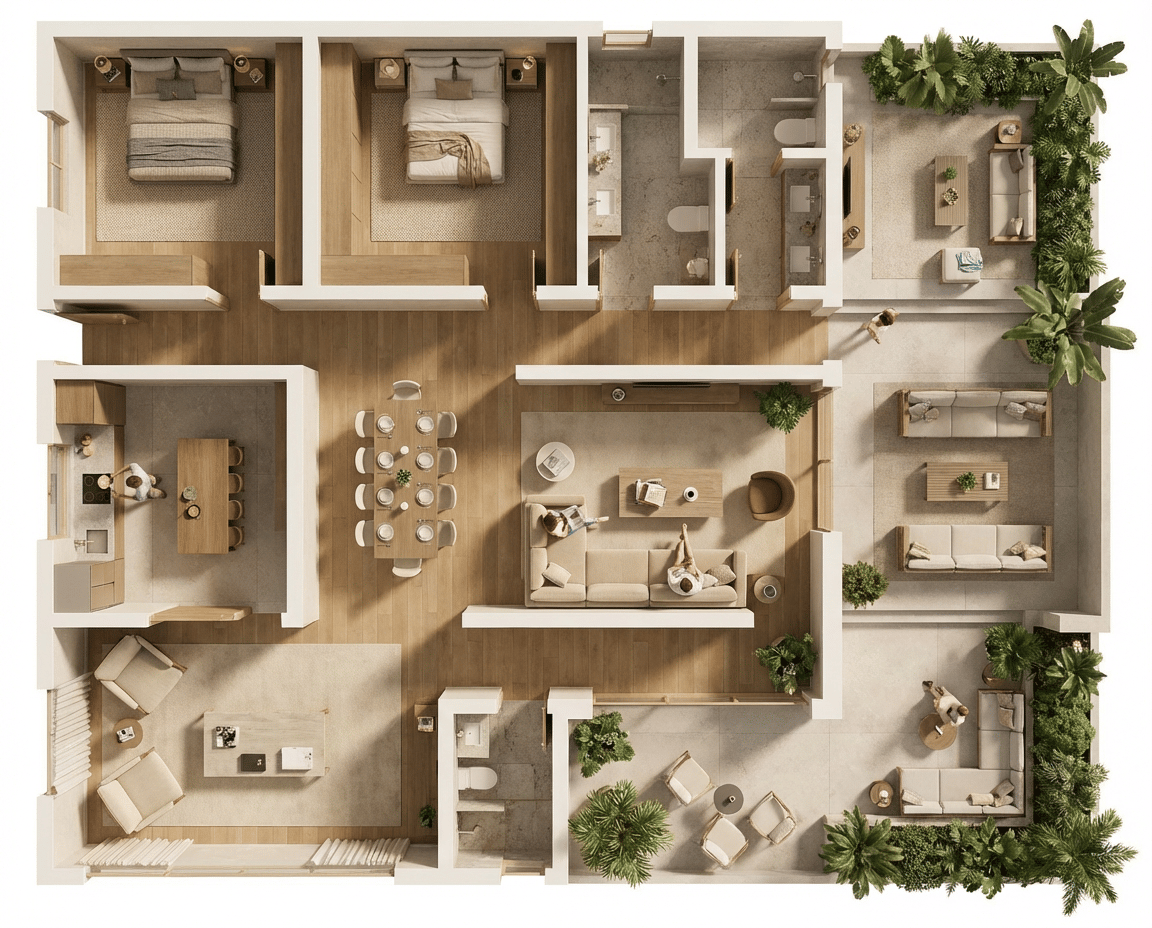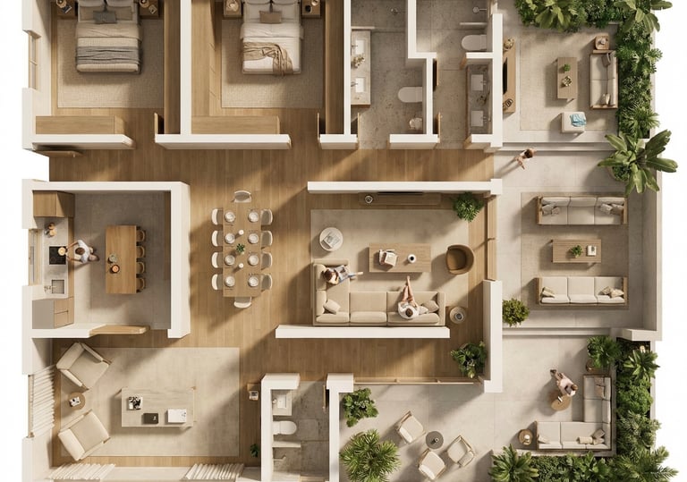 Beautifully crafted floor plans designed for marketing materials, helping buyers clearly understand the layout, flow, and potential of each residence.