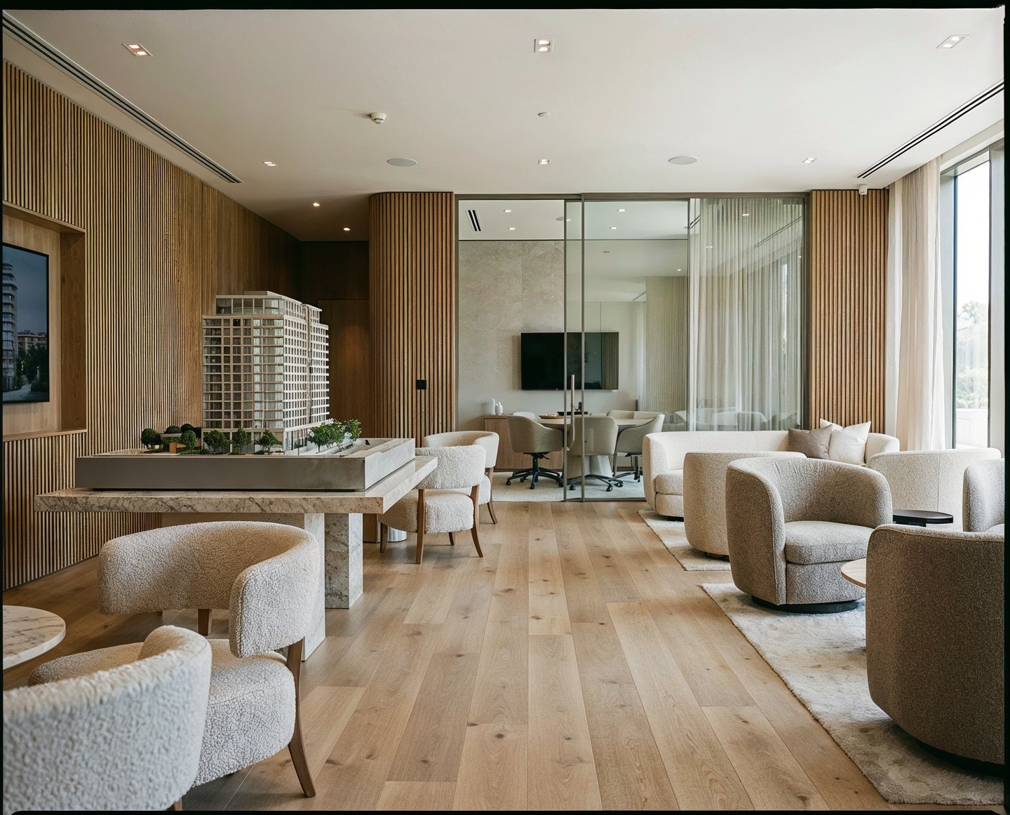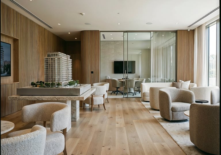 Design of immersive sales environments where developers can showcase the project through models, renders, and curated interior experiences.